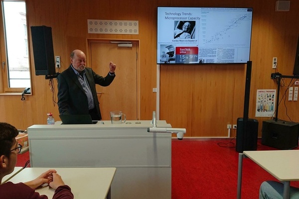 Mit seinem humorvollen Vortrag über die vielfältigen Anwendungsgebiete von Supercomputern begeisterte Prof. Jack Dongarra die Schülerinnen und Schüler der Kursstufe. Phillip Streckenbach berichtet.