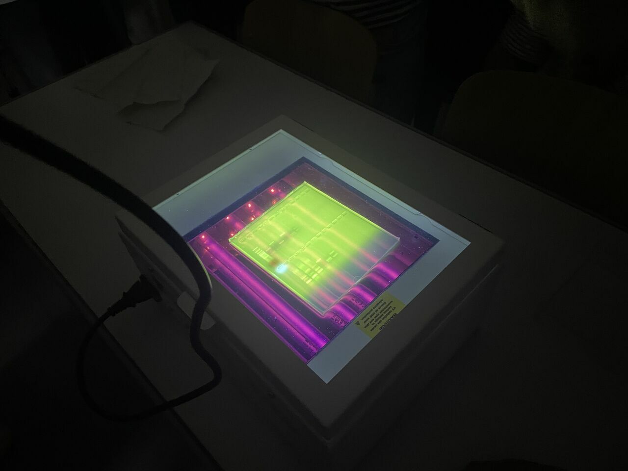 Um die eingangs gestellte Frage zu beantworten, setzten wir uns mit dem typischen Vaterschaftstest und der dahinter steckenden molekularbiologischen Techniken auseinander. Im Wechsel zwischen Theorie und Praxis wiederholten wir die Polymerase-Kettenreaktion (PCR) und führten diese eigenständig durch. Zudem stellten wir ein Agarosegel her, auf dem wir im Anschluss unsere Proben untersuchten. Nach dem Auftragen der PCR-Produkte begann die Elektrophorese, bei der wir beobachten konnten, wie die DNA-Banden sichtbar wurden.