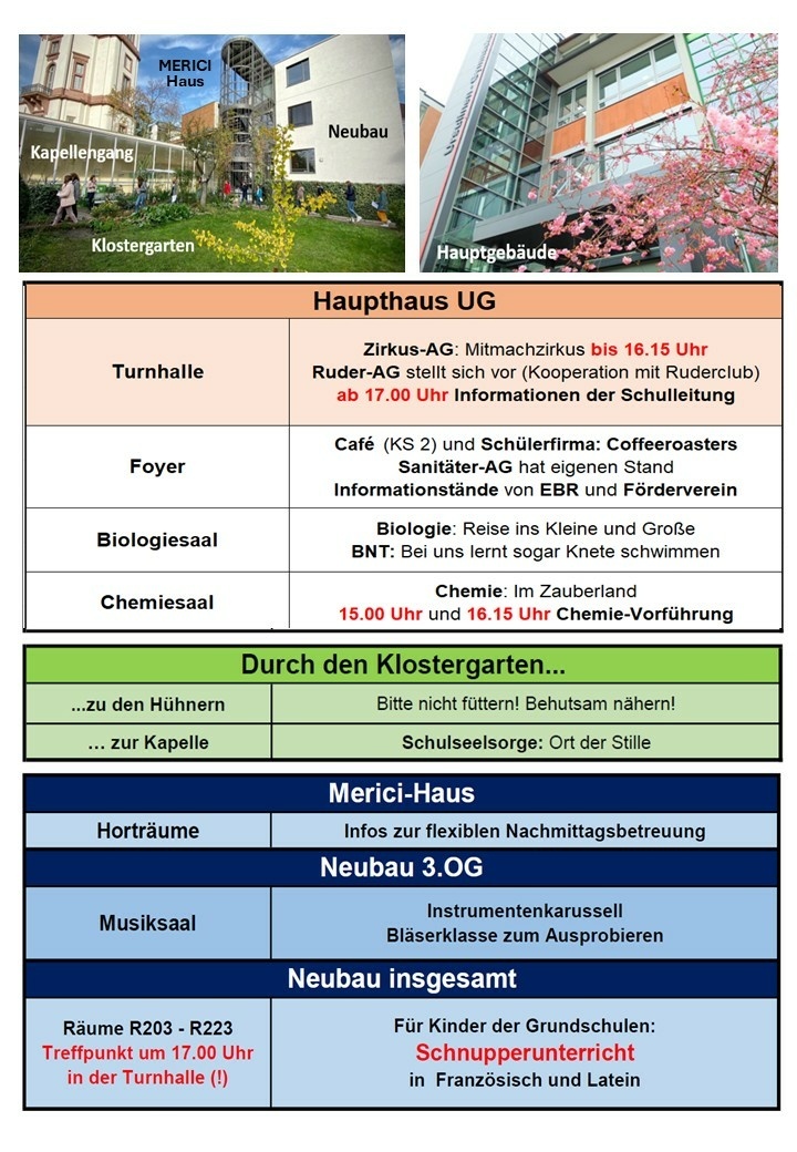 Es wird von 14.30 Uhr bis 17 Uhr wieder Informationen für Erwachsene und Mitmachangebote für die Kinder geben. Während ab 17 Uhr in der Turnhalle dann die Schulleitung interessierte Eltern über die Schule informiert, können die Kinder am Schnupperunterricht Latein oder Französisch teilnehmen.