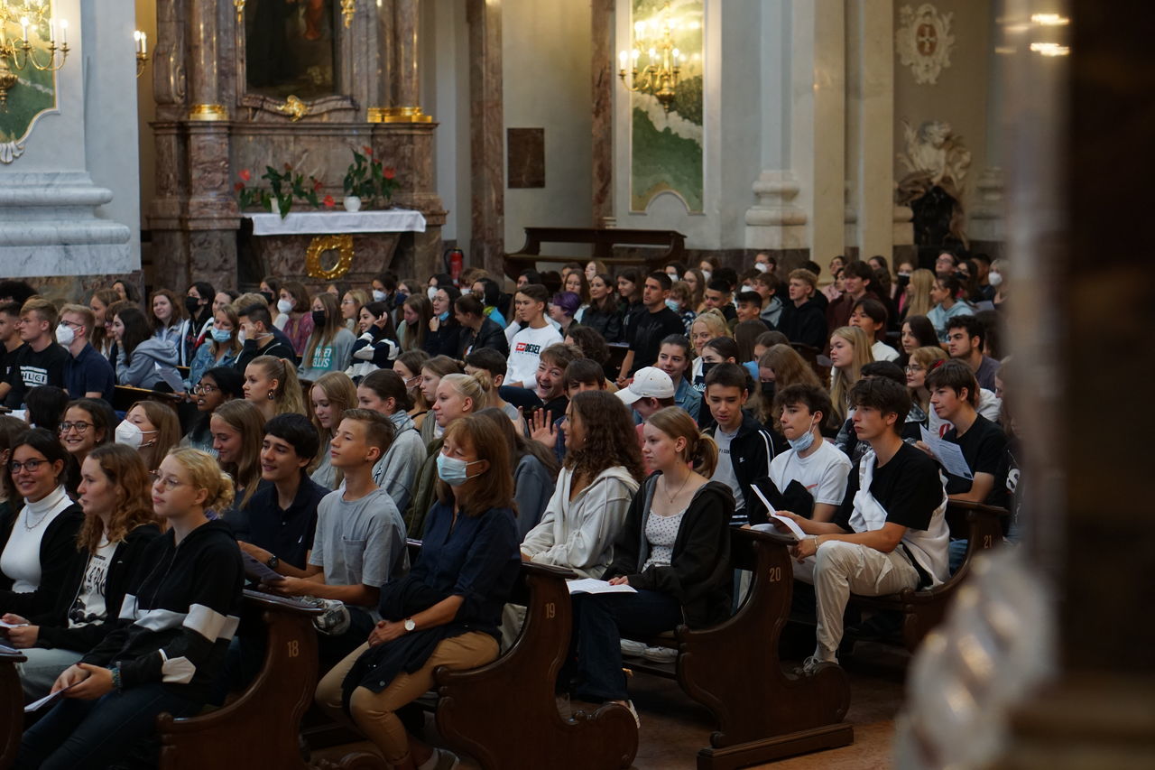 Umso wichtiger war es, dass sich die Schulgemeinde zusammen auf das neue Schuljahr einstimmen und gegen Sorgen und Ängste ansingen konnte. Frau Dr. Oettinger, Frau Bartaune und Herr Grän zeichneten musikalisch verantwortlich und animierten durch ihren engagierten Vortrag die Schulgemeinde zum Mitsingen. Den Schülerinnen und Schülern war die Begeisterung anzumerken. Der Geist des Gottesdienstes übertrug sich sogleich in die Klassenzimmer. Dort konnte der Regelunterricht mit einem Gefühl der Dankbarkeit und Normalität beginnen, im Wissen um die Unwägbarkeiten, die die Zukunft bereithalten wird. In unsicheren Zeiten endlich wieder gemeinsam unterwegs!