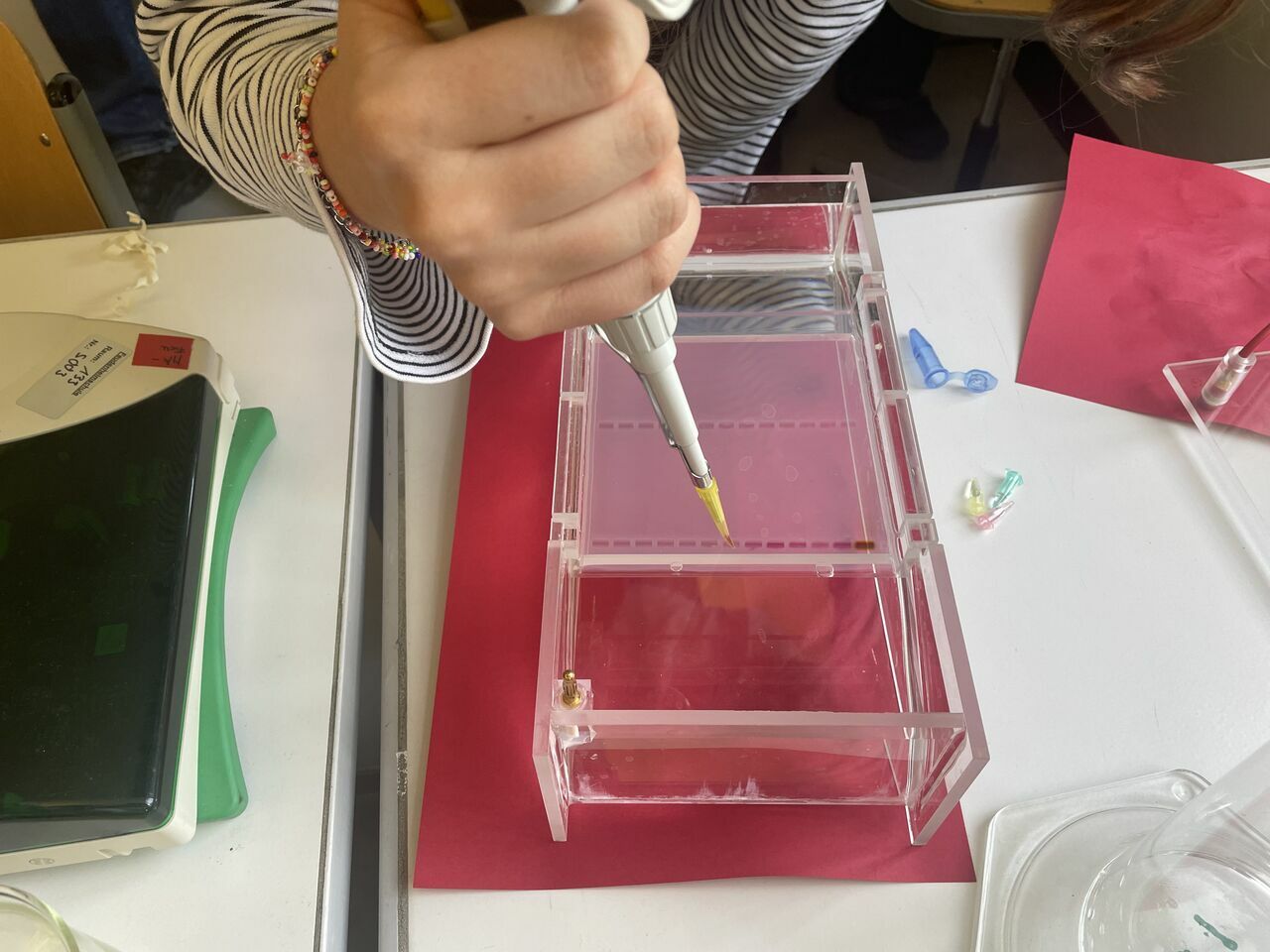 Um die eingangs gestellte Frage zu beantworten, setzten wir uns mit dem typischen Vaterschaftstest und der dahinter steckenden molekularbiologischen Techniken auseinander. Im Wechsel zwischen Theorie und Praxis wiederholten wir die Polymerase-Kettenreaktion (PCR) und führten diese eigenständig durch. Zudem stellten wir ein Agarosegel her, auf dem wir im Anschluss unsere Proben untersuchten. Nach dem Auftragen der PCR-Produkte begann die Elektrophorese, bei der wir beobachten konnten, wie die DNA-Banden sichtbar wurden.