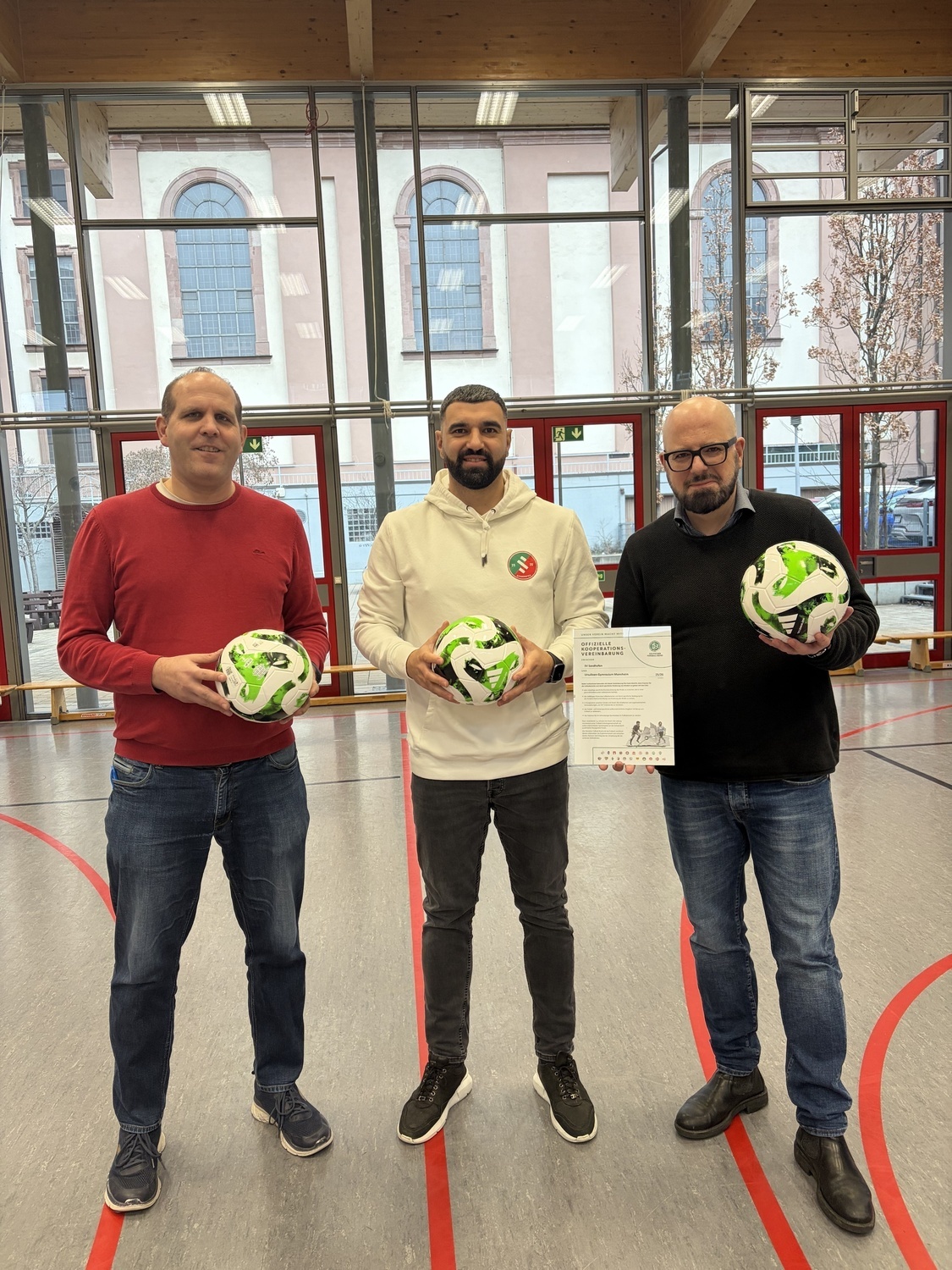 Das UGM und der SV-Sandhofen setzen ihre bereits bestehende Kooperation fort. Beide lnstitutionen bekundeten nun mit einer offiziellen Vereinbarung ihre feste Absicht, auch in Zukunft neue lmpulse für die fußballerische und damit sportliche Förderung von Kindern zu geben. Am UGM wird schon seit längerer Zeit eine Fußball-AG durch den SV Sandhofen betreut. Auf dem Bild zu sehen, von links nach rechts: Andreas Botsch (Abteilungsleiter Mittelstufe), Daniel di Gregorio (Mitarbeiter SV Sandhofen, ehemaliger Fußballprofi), Alexander Stöckl (Schulleiter UGM).