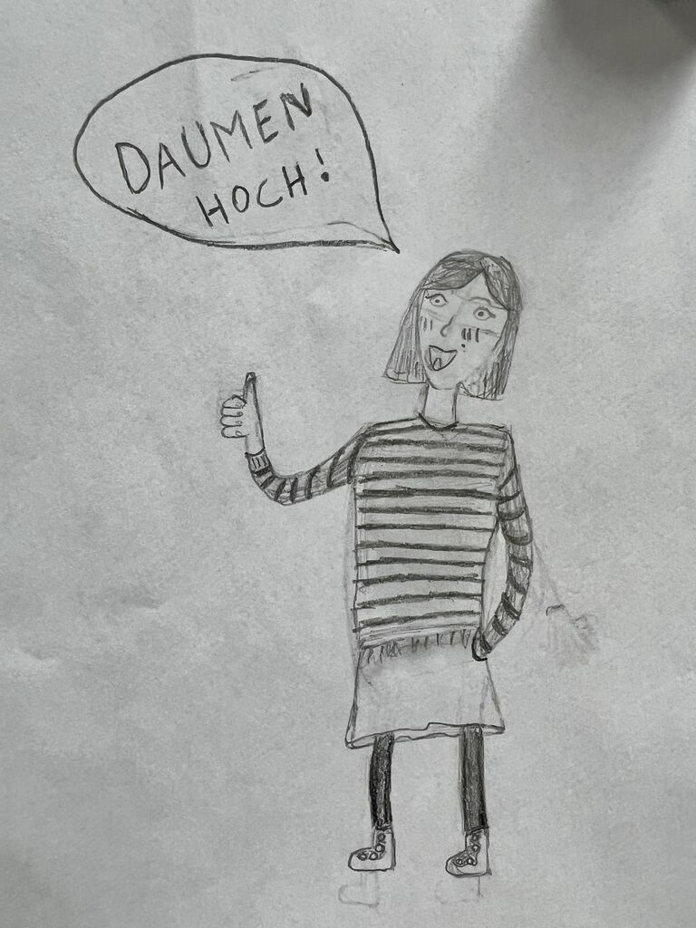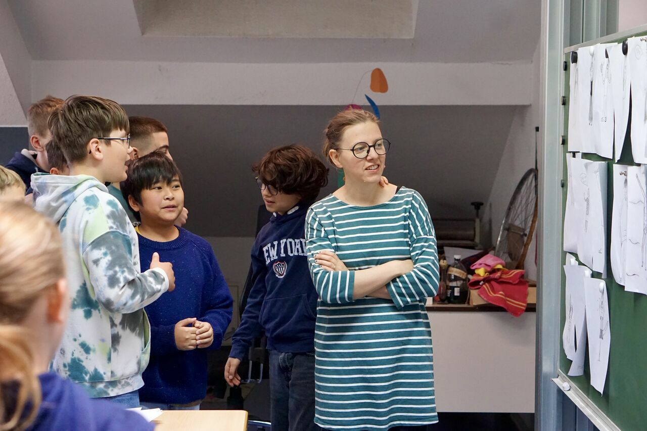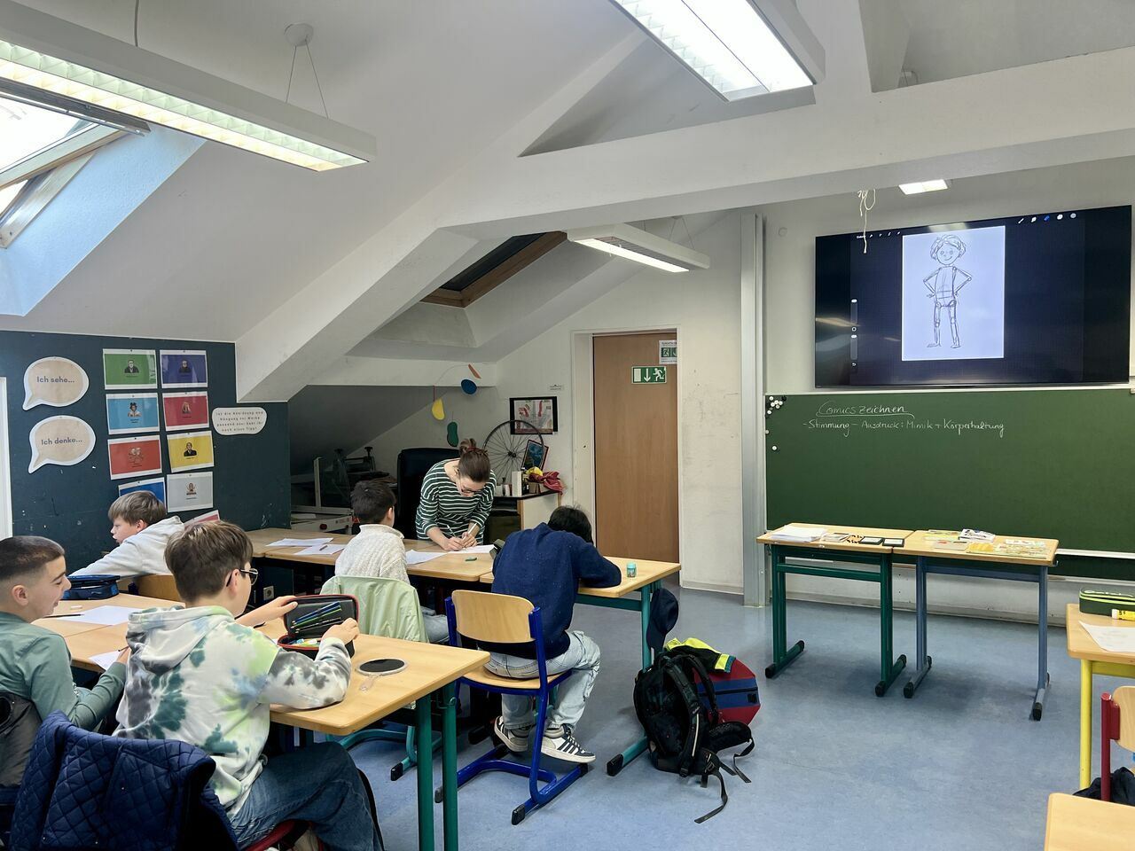 Danach kombinierten die Schülerinnen und Schüler Körperhaltung und Mimik, um Figuren mit klar erkennbaren Stimmungen zu zeichnen. Im zweiten Teil gestalteten sie ein Comic-Selbstporträt. Dazu beschrieben sie ihr äußeres Erscheinungsbild, typische Haltungen, Kleidung sowie besondere Merkmale ihres Gesichts. Auch persönliche Stärken und „Superkräfte“ wurden überlegt und in der Figur sichtbar gemacht. Zum Abschluss erhielt jede Comicfigur eine passende Sprechblase mit einem Satz, der den eigenen Charakter unterstreicht. So entstanden viele individuelle und kreative Comic-Selbstporträts, bei denen Constanze von Kitzing die Kinder Schritt für Schritt anleitete und unterstützte.