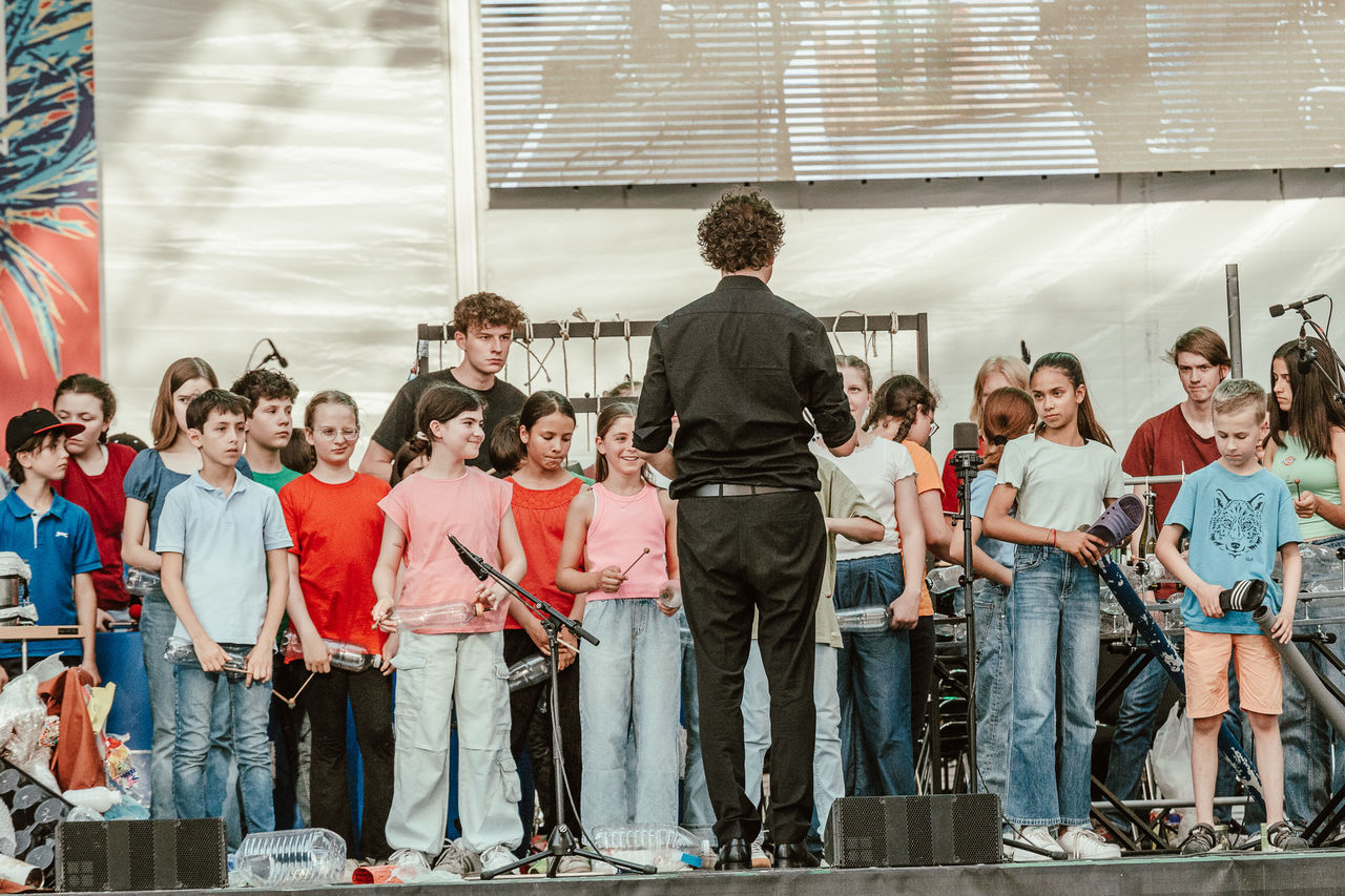 Etwa 700 Besucherinnen und Besucher kamen am Abend des 9. Juli zur Hauptbühne Spinelli auf der Bundesgartenschau, um dem Gemeinschaftskonzert der Mannheimer Bläserphilharmonie und des neu gegründeten Upcycling-Orchester des Ursulinen-Gymnasiums Mannheim zu lauschen. Eine beeindruckende Kulisse! Nach der Eröffnung durch die Bläserphilharmonie gehörte die Bühne für eine halbe Stunde den 30 Schülerinnen und Schülern des Ursulinen-Gymnasiums. Gespielt wurden selbst komponierte und erfundene Stücke – experimentelle Musik im Stile John Cages über Minimal Music und Samba bis hin zu einem groovenden Techno.